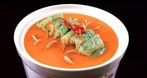3.大白菜葉焯水,包入餡料卷成卷兒,依次包好6個,擺入深盤中,旺火蒸8分鐘至熟。