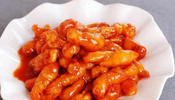 3、另起鍋加少量食用油,油熱後倒入剛剛調好的醬汁和炸好的裡脊肉條,翻炒至每一塊裡脊肉都裹上醬汁就可以裝盤瞭。