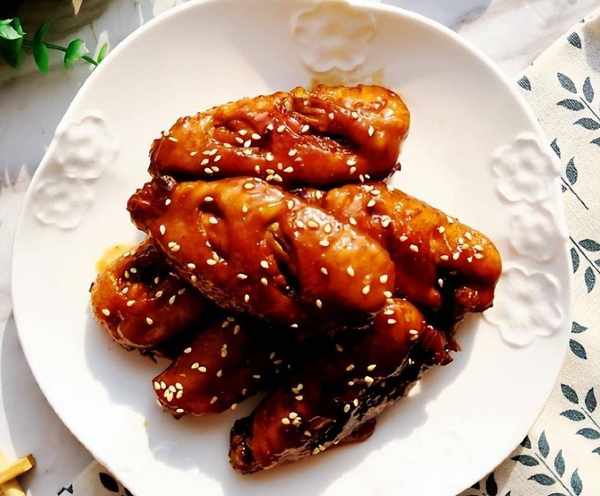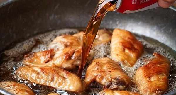 2、另起鍋倒入適量的食用油,油熱後轉小火,鍋裡加入幾顆冰糖,翻炒至冰糖融化後把雞翅倒入鍋中,翻炒裹上糖色,加入蔥薑段、生抽、老抽把雞翅翻炒上色後,倒入一瓶可樂大火燒開後轉小火慢煮二十分鐘,煮至湯汁濃稠後轉大火收汁,出鍋前撒點食鹽和雞精調味就可以裝盤瞭,最後撒點白芝麻裝飾。