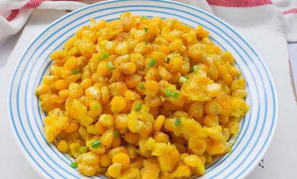 2、炒鍋裡倒入適量食用油,油溫七成熱時把玉米粒倒進鍋中,翻炒六分鐘左右,玉米粒變得金黃後盛進幹凈無水漬的盆中,撒上黑胡椒粒和蔥花攪拌均勻後倒入盤中,一盤美味誘人的椒鹽玉米就做好瞭!