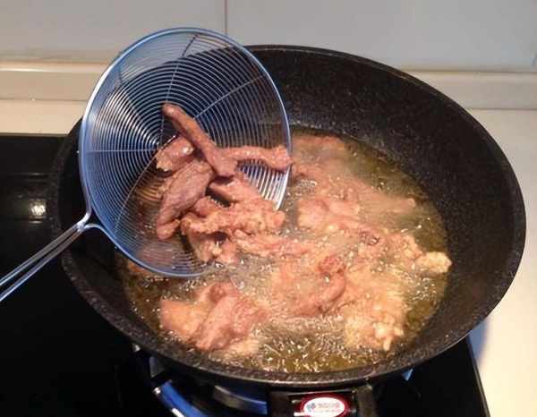 2、起鍋燒油,油溫七成熱時,把醃制好的裡脊肉條裹上淀粉下鍋開炸,肉條下鍋時註意不要粘連。炸五分鐘左右把裡脊肉條全部撈出,再下鍋復炸一分鐘就可以撈出備用瞭。