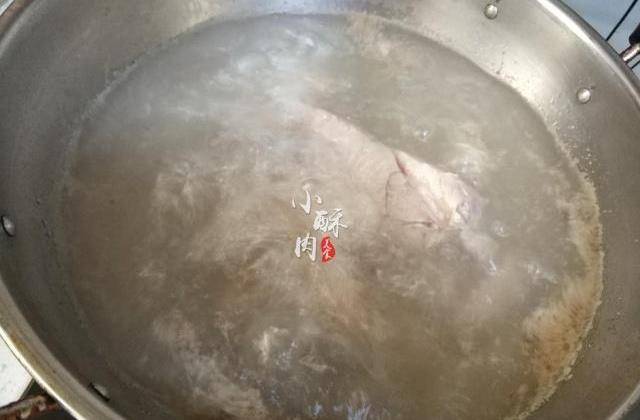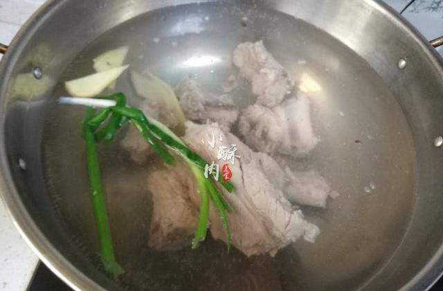 鍋裡燒水,水開後下入排骨和蔥結、薑片,再加入少於幾滴陳醋,大火燒開後轉小火燉20分鐘。(加入幾滴陳醋可以更好的釋放出排骨中的鈣質)