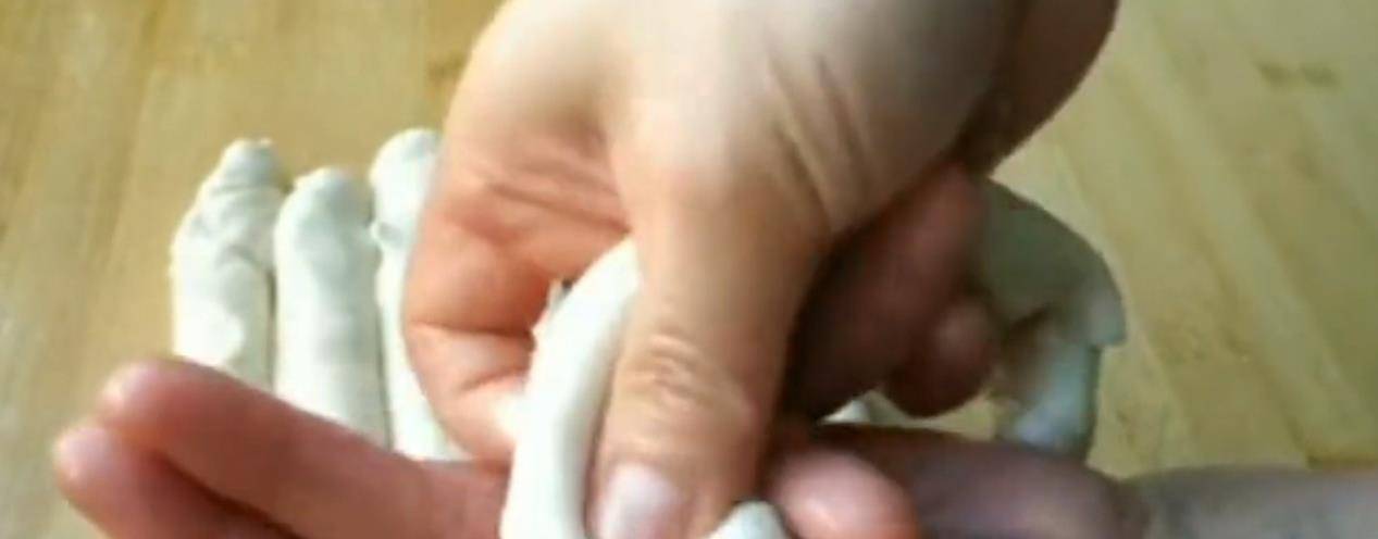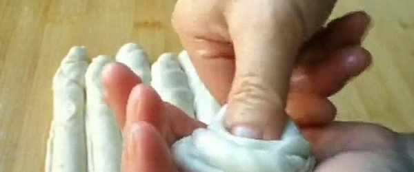 【步驟六】全部卷完之後,拿起最先卷好的第一個面卷,把它的一頭放在掌心,一邊旋轉一邊用拇指按壓疊在一起,這樣一個油塔子的生坯就做好瞭。