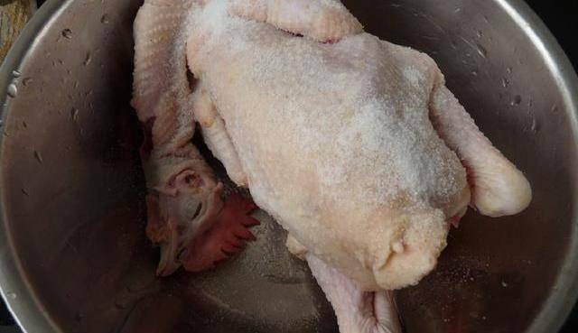 火力調到小火,把雞浸到水裡1分鐘左右,撈起,晾在空氣裡3分鐘左右,這方法重復三次