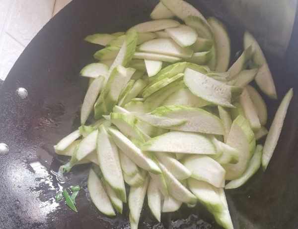 鍋裏加入花生油,入葱絲薑絲爆香,倒入絲瓜片煸炒均勻。