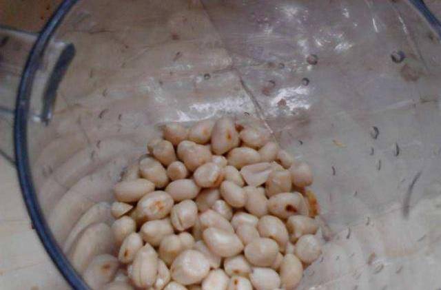 3、去皮後,把花生仁放入料理機裡面攪打,攪打到花生粘成塊再取出