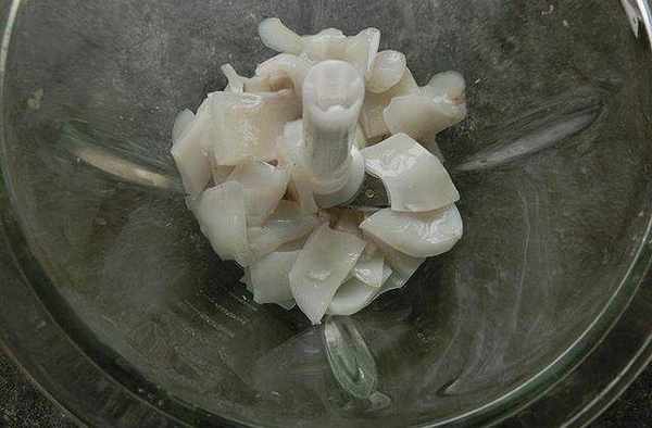3、處理好的墨魚,把墨魚片切成小片,放入攪拌機內攪拌成泥;