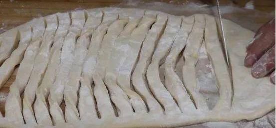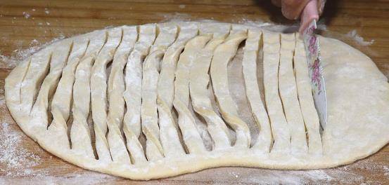 2、30分鐘後,面團已經餳發好瞭。這個時候在案板上撒上適量的幹面粉,將面粉塗抹均勻,然後將面團取出來放在案板上用手按扁。然後用搟面杖搟成長方形面皮,面皮搟好以後用小刀從中間出若幹個口子,一隻手切,一隻手按住,底部不要切斷。然後將切好的面條六個為一組,把它切開。兩隻手捏住面條額兩端,一邊拉抻,一邊摔打,將面條拉長拉細就可以瞭。