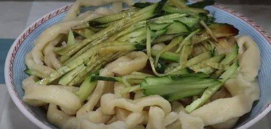 4、面條煮熟以後控水撈出,然後放入涼水中過一遍涼水。面條過涼以後控水撈出,放入盤中。接下來在盤中放入切好的黃瓜絲,然後按個人飲食習慣和口味,加入適量的生抽、陳醋和辣椒油,將調味料充分地翻拌均勻即可食用。