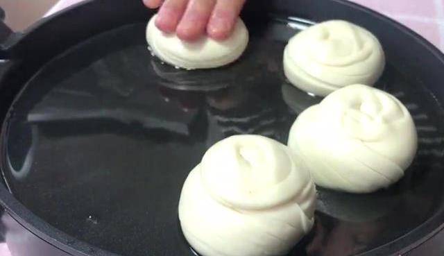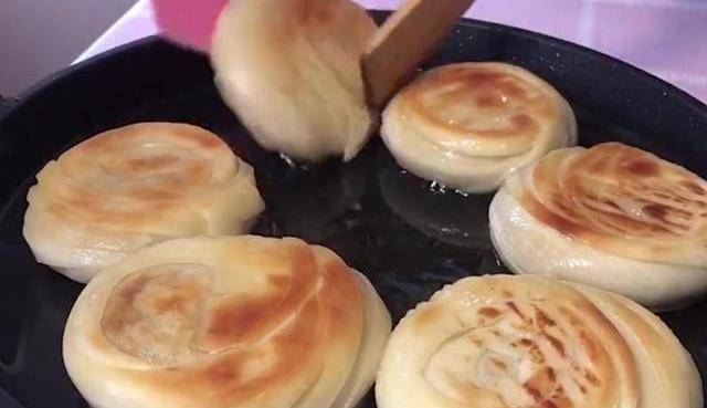 我們在案板上抹適量的油,取一個面劑按扁,然後再用搟面杖給它搟成一頭寬一頭窄的長條,不需要搟得太薄,像這樣就可以瞭。然後表面再抹上一層油,在寬頭的一處放上肉餡,再放點蔥花,像這樣給他提起面皮兒交叉對折,然後抓起拉長,從下往上面卷起來,邊卷邊稱,剩下的最後面皮。用刀劃成細條,頂端不要劃斷瞭,然後再給它卷起來,收尾處壓在底部,這樣一個生僻就做好瞭。看一下卷好以後裡面還有氣,電餅鐺開小火,多放一點油,這樣烙出來以後表面才會酥脆,把做好的餅皮放鍋中,蓋上蓋子,烙至一面定型,變色後翻面再烙另一面。另一面烙至變色後給他來回翻面,直到煎至兩面金黃酥脆。像這樣用鏟子按壓能夠快速回彈,就說明熟透瞭。像這樣就可以出鍋瞭。我們的香酥肉餅就算好瞭,表皮特別酥脆,捏一捏就能掉渣。