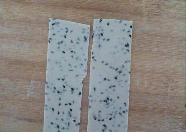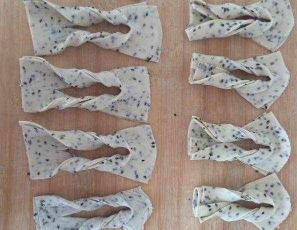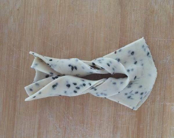 切好的面皮展開,從中間刀口中掏轉過來,翻成花。