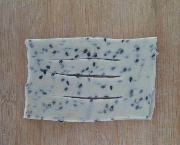 把對折好的面片中間切條,頂端不要切透,每三刀斷開。