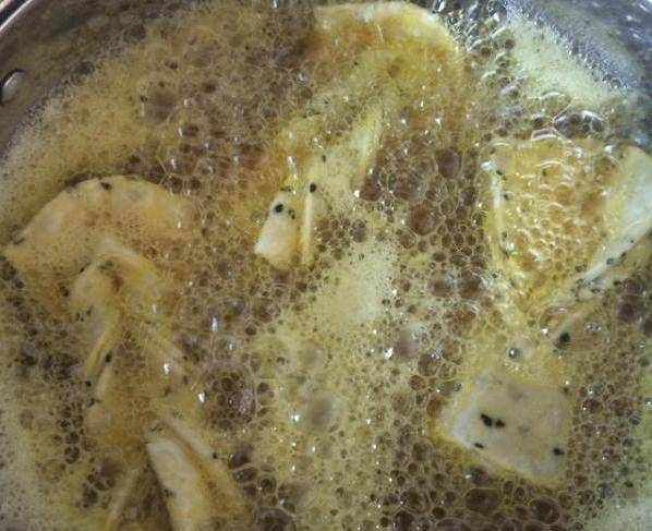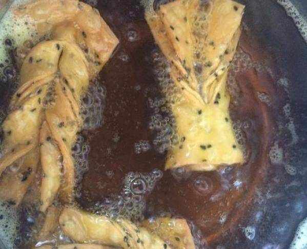 放入排叉生坯,中小火慢慢炸透,用筷子輕輕推動,使其受熱均勻