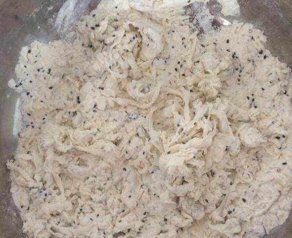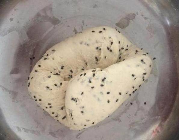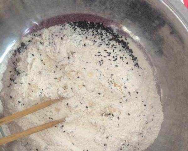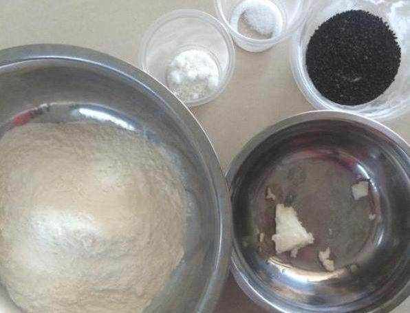 面粉500克,雞蛋兩個(我直接放在面粉裡瞭),豬油(或者植物油)20克,鹽7克,糖10克,黑芝麻適量,水大概190克左右