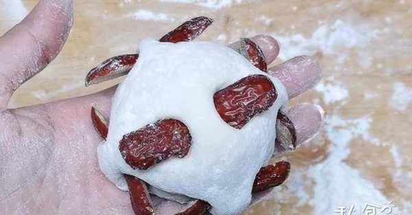 4、取出一個面劑子用手揉成饅頭狀,整理好形狀後,用手指在饅頭中間位置戳兩個洞,將切好的紅棗片插進去,在饅頭下面也重復這個動作,都均勻的將紅棗插入到饅頭上,看看一個漂亮的紅棗饅頭做好瞭。