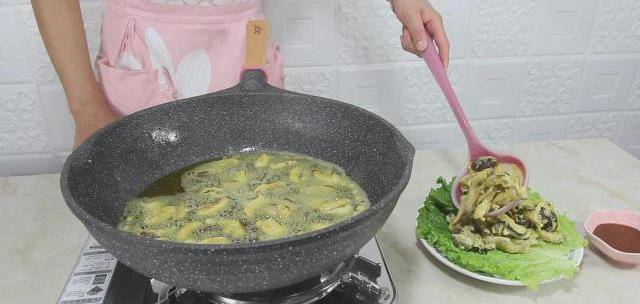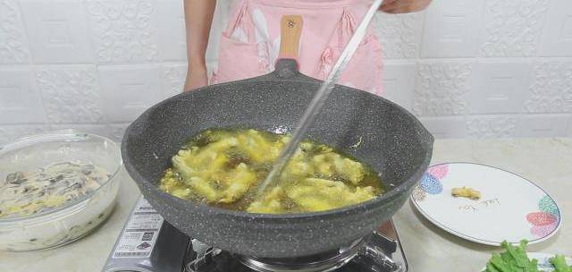 6、鍋中倒油,燒至6,7成熱,將切好的香菇條滾上面糊,放入油鍋中炸制