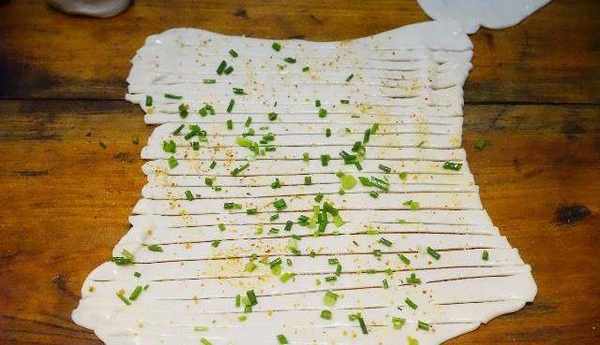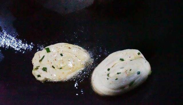 刷一層油撒上蔥花再加入點椒鹽;