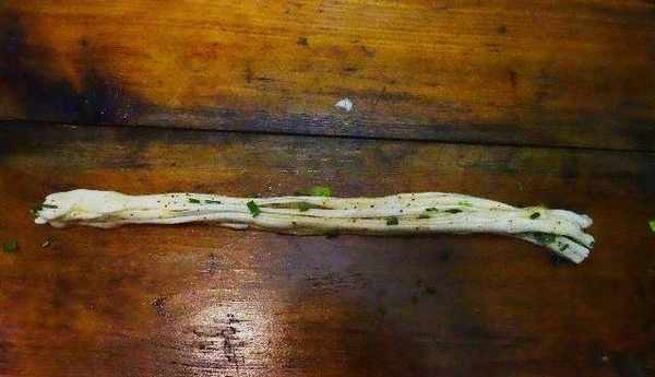 從上至至卷起後慢慢輕拉面團兩端,對折二次再拉長;