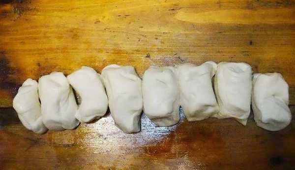 面團拉成長方形再分切成七八塊左右大小;