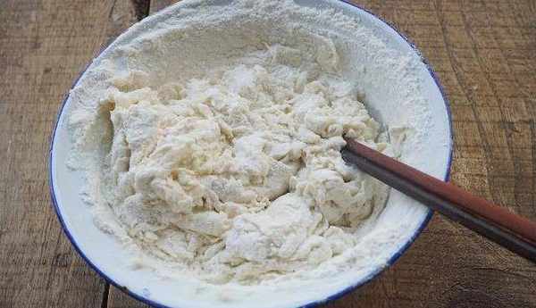 步驟:將面粉倒入盆中,緩緩倒入溫水和鹽,邊倒水邊用筷子順時針攪動,攪成絮狀;