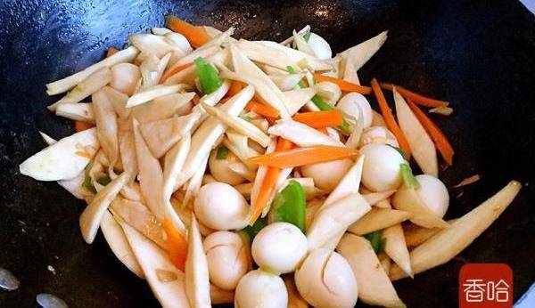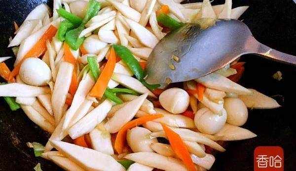 10.加焯過水的茭白。青椒、鵪鶉蛋翻炒。