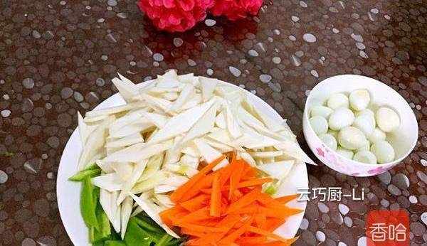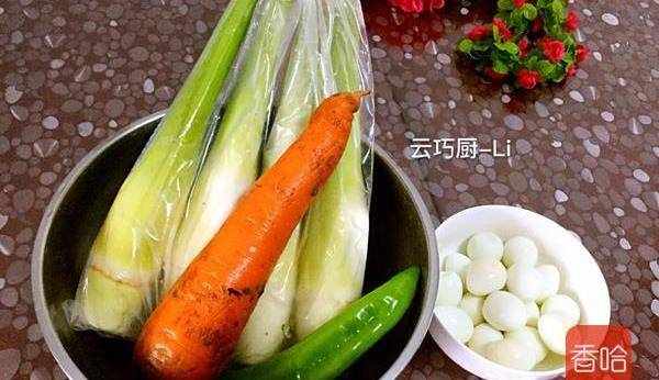 1.準備好食材。茭白400克、胡蘿卜50克、青椒30克、去掉殼熟鵪鶉蛋100克。