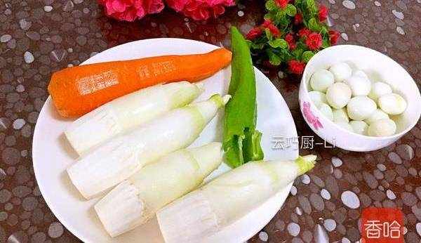 茭白400克、青椒30克、胡蘿卜50克、鵪鶉蛋100克、生薑10克、蒜15克、小蔥10克、鹽5克、花生油15克、蠔油20克、料酒15克、醬香鮮醬油10克