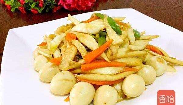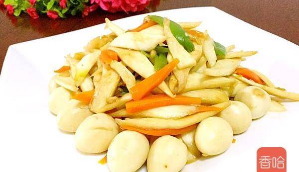 12.裝盤,一道營養豐富,口味獨特、鮮嫩可口的茭白蠔油炒鵪鶉蛋就可以上桌。