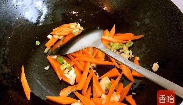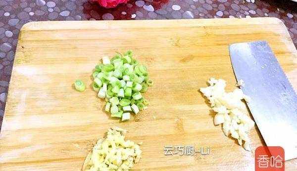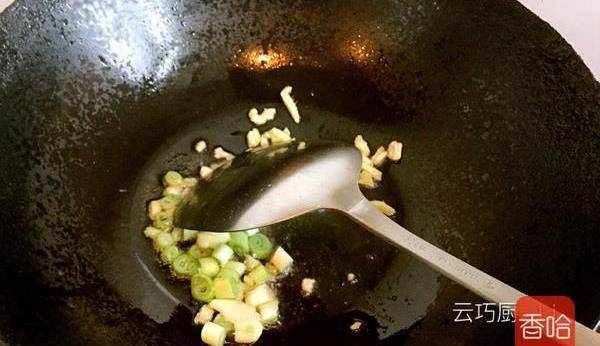 8.熱鍋加10克花生油,油溫加熱7成熱放入蔥、薑、蒜大火爆香。