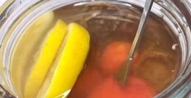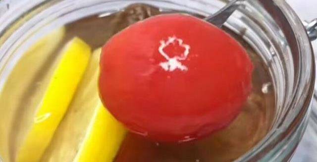 第四步:已經放入小番茄罐裡放入幾片檸檬,最後加入我們剛煮好的冰鎮梅糖水,糖水的量剛過食材,去瓶口就可以瞭,太多也不能太少,然後密封,放入冰箱冷藏一晚,就可以吃瞭,冷藏一晚的話,梅子番茄的口感最好。