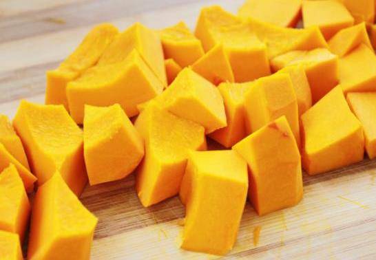 1,我們先準備好一塊南瓜,把南瓜清洗幹凈之後去掉外皮,南瓜的皮是比較厚的,直接用去皮刀可能會有些費力,我們可以用刀削。南瓜處理好瞭以後,把它切成大小合適的丁放在碗中備用。