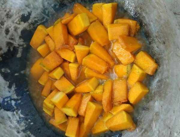 2,鍋中倒入少量的油,油熱之後把切好的南瓜放入鍋中,再加入少量的食鹽調味,然後用鏟子不停的翻炒,因為南瓜中含有糖分,要防止南瓜粘鍋,當炒至南瓜稍微變軟的時候,在鍋中加入適量的清水,水量隻要沒過南瓜就可以瞭。