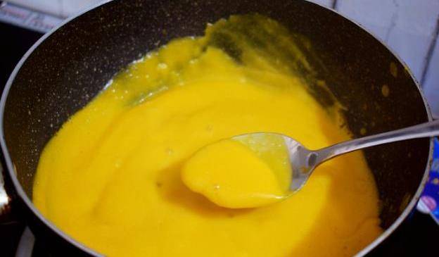5,南瓜煮好以後,把火關小,用鏟子按壓成南瓜泥,然後倒入之前做好的面糊水,面糊水倒入鍋中以後,我們要用鏟子快速的攪拌,讓面糊水和南瓜泥完全融合在一起,當水分慢慢被收幹以後我們就可以關火瞭,放涼之後就可以食用瞭。