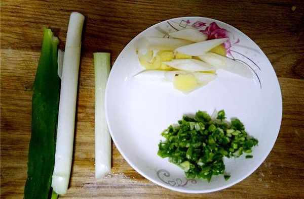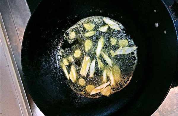 鍋入油,在油剛加熱時,便將蔥白和薑片放入鍋中,炸至略微焦黃時即可,將蔥薑撈出。
