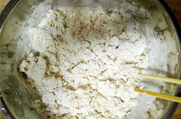 取面粉500克放入盆中,一邊加入開水,一邊用筷子攪拌,待成幹溫適中的絮狀即可。