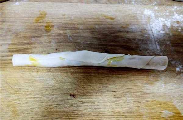 將面皮朝一個方向卷起來,呈細條狀。要一隻手卷,另一隻手拉拽,要盡量卷的緊一些。