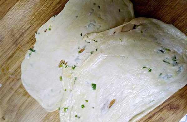 將劑子搟成薄面餅,抹上調制好的蔥油,撒上蔥花。