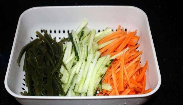 第一步:黃瓜洗幹凈以後,切成片然後再切絲,海帶提前用冷水泡發,接著沖洗幹凈,然後切成絲;胡蘿卜1個去皮,接著切成絲備用。