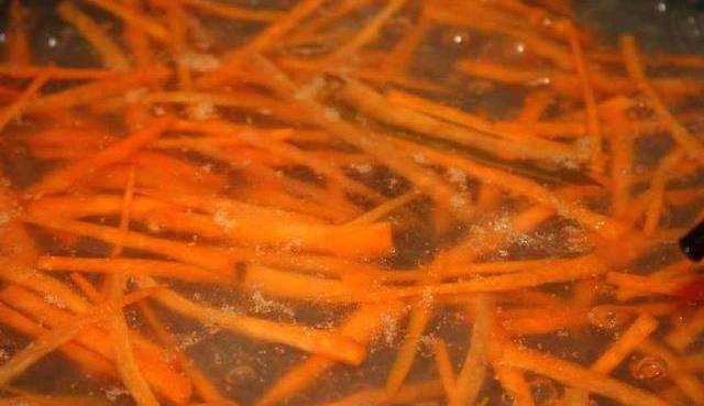 第三步:另外把胡蘿卜絲也放進去焯一些水,胡蘿卜的營養熟的更容易被人體吸收,變色以後盛出放入幹凈的容器中。