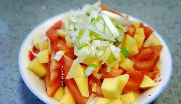 土豆去皮洗凈切丁,西紅柿洗凈切丁,蔥去皮洗凈切碎。