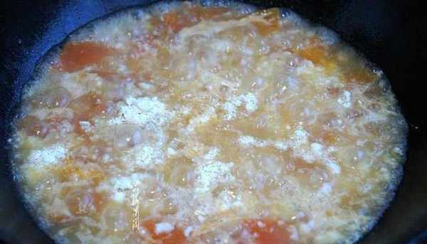 炒至番茄丁基本碎瞭並出來湯汁,然後加入適量的水大火燒開。
