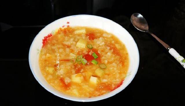 疙瘩湯:食材:面粉200g;土豆1個;西紅柿1個;油適量;鹽適量;五香粉適量;胡椒粉適量;蔥適量;味極鮮醬油適量。
