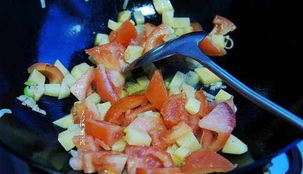 炒鍋加入適量的油,爆香五香粉和蔥花,加入番茄土豆丁翻炒。
