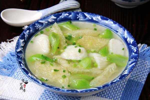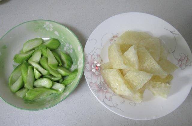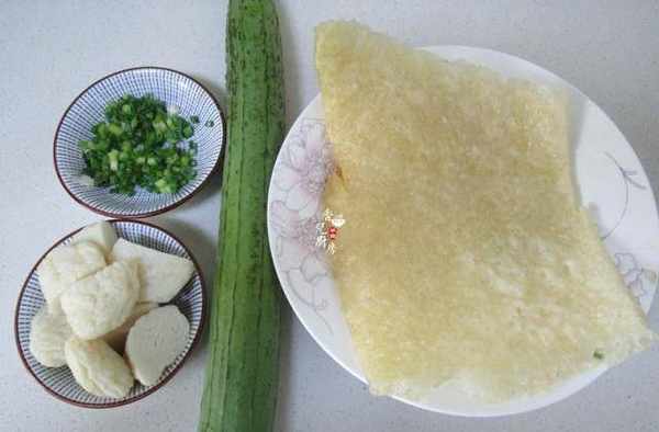 詳細做法;1、備好絲瓜,墨魚丸,油發肉皮先要用清水泡軟,油發肉皮很輕的10克能發這樣大,小蔥洗凈後切成蔥花。