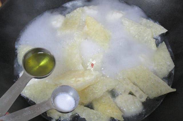 4、再把肉皮倒入鍋中,繼續大火燒開後加入鹽和橄欖油調味,不用橄欖油可以用其它的熟油。