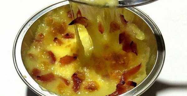 3、熱鍋放油,轉小火,油熱後把土豆面粉湖倒入鍋裡,用鏟子按扁攤平,小火慢煎;
