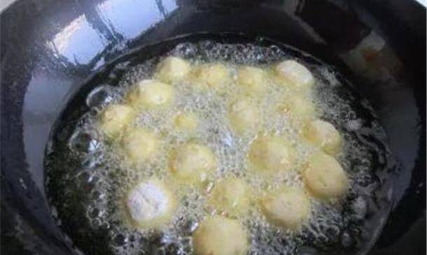 炸的時候要用寬油炸,等到油溫差不多五成熱的時候,把丸子沿著鍋邊滑進去。油溫太高的話,丸子放進去很容易散掉,所以炸的時候一定要註意把握好下丸子的時機。炸成金黃色就可以撈出食用瞭。