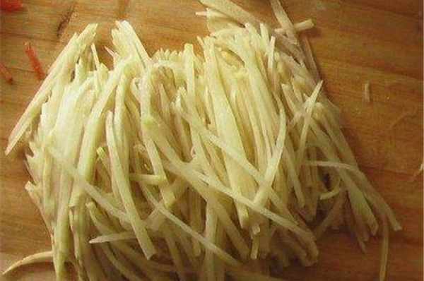 第一步,把我們準備好的土豆,洗幹凈去皮,然後切成細絲,土豆絲越細越好,差不多切成我們做醋溜土豆絲那個粗細就行。炸土豆丸子最好是把土豆切絲,這樣炸出來的丸子會比較好吃。切好的土豆不用再沖水洗掉淀粉,也不用上鍋焯水。為瞭外表更好看,其實我們可以稍微搭配一下丸子的顏色,可以切一點胡蘿卜或者青椒放進去,當然這兩種也要切成細絲兒,覺得麻煩也可以不放,看個人喜好。