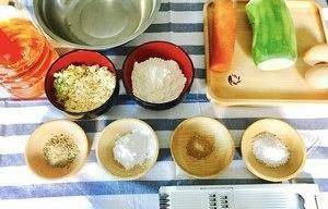 把調料準備好,把蔥薑和豆腐皮切碎末,準備好蘿卜絲擦子和攪拌盆。