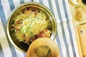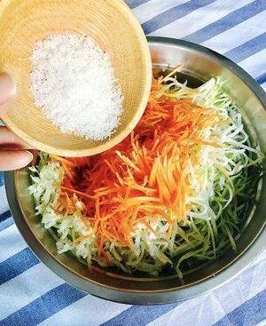 把蘿卜和胡蘿卜擦絲後倒入鹽,用手攪拌擠壓,一直醃漬出水。